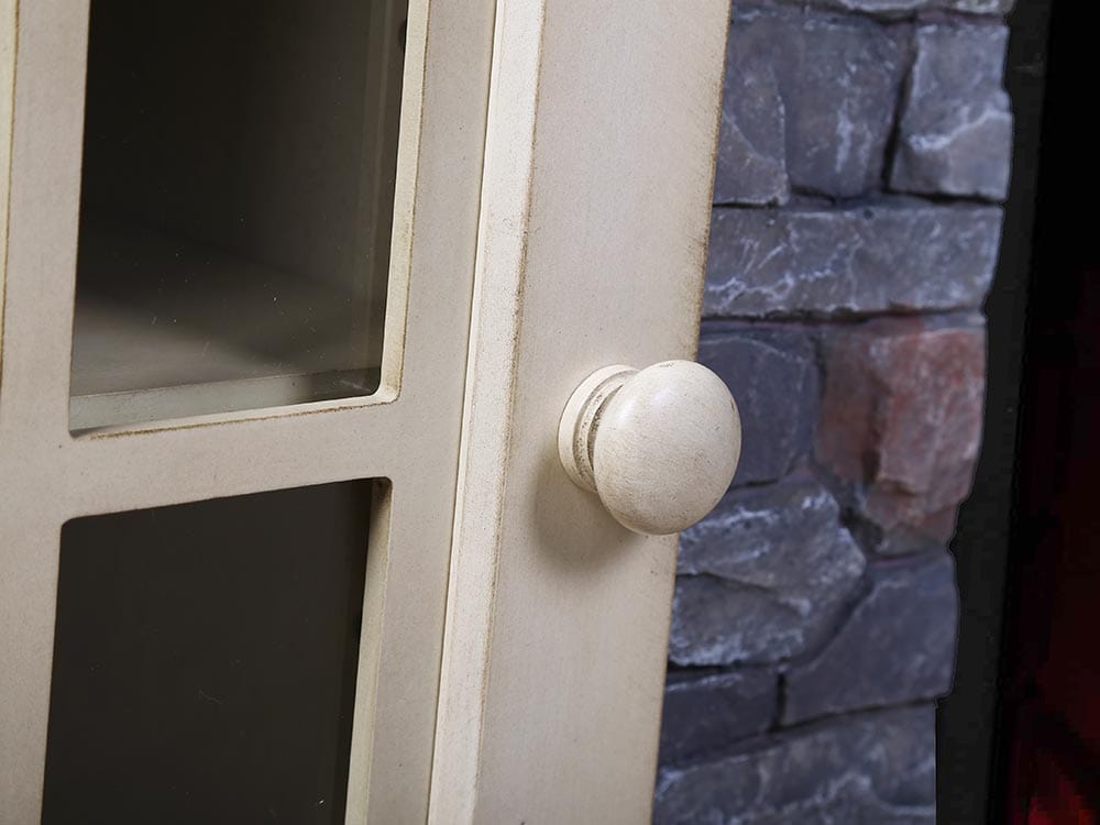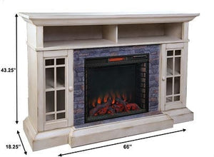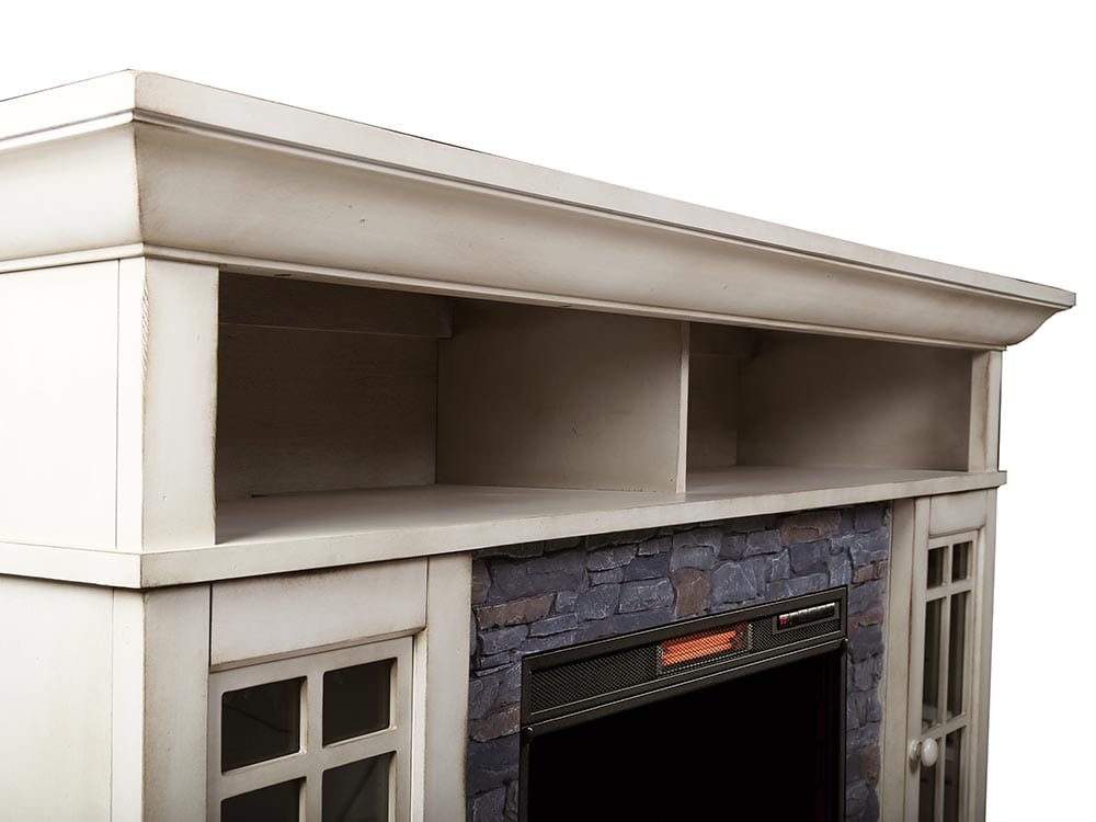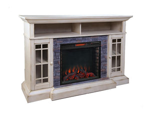 Add the rustic appeal of the Bennett Electric Fireplace TV Stand to your family room or den for a charming upgrade to your space. Speaking to the rustic, worn design trends taking the industry by storm, the Bennett has a distressed Ivory finish as well as a printed stacked stone surround. When it comes to setting up your TV and electronics, the Bennett addresses all your needs perfectly. The console is capable of holding flat screen TVs up to 70" in size and features two open media shelves for either your DVD player or cable box. You'll find additional convenient storage in the two side cabinets that are fronted with pane glass.