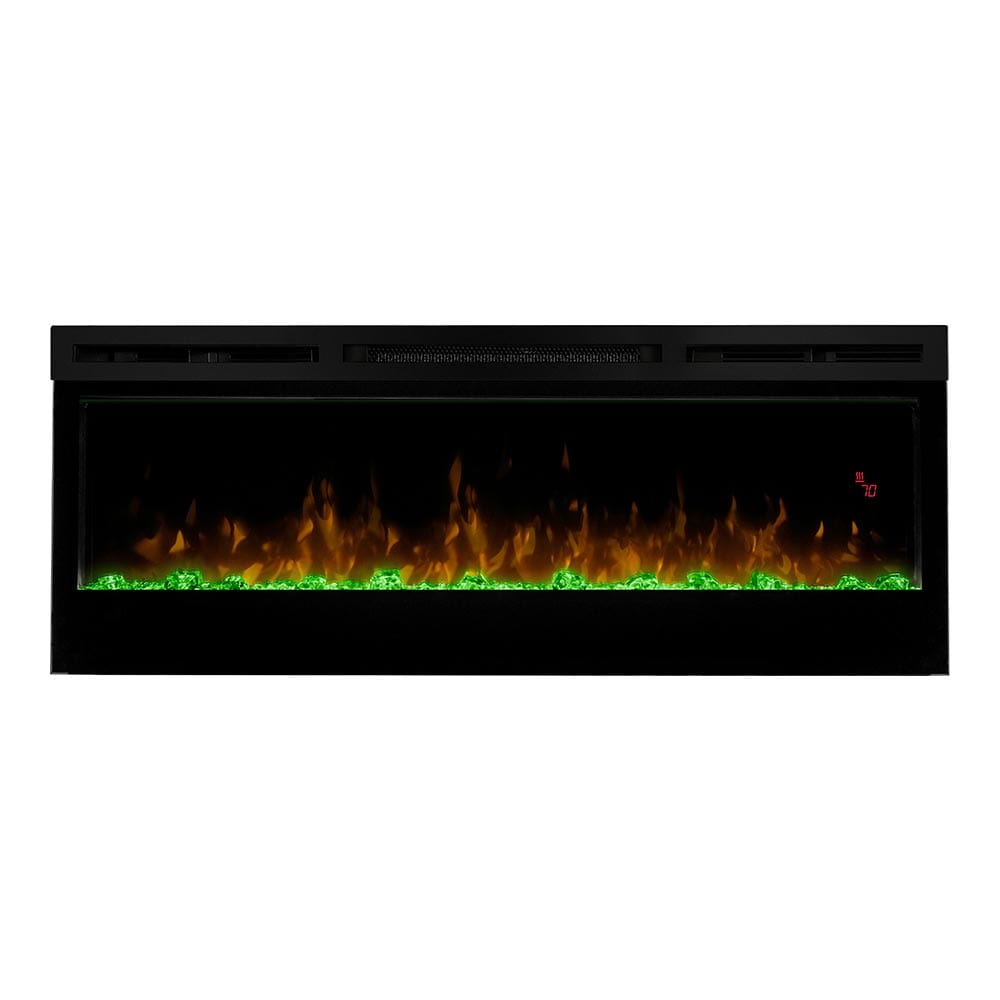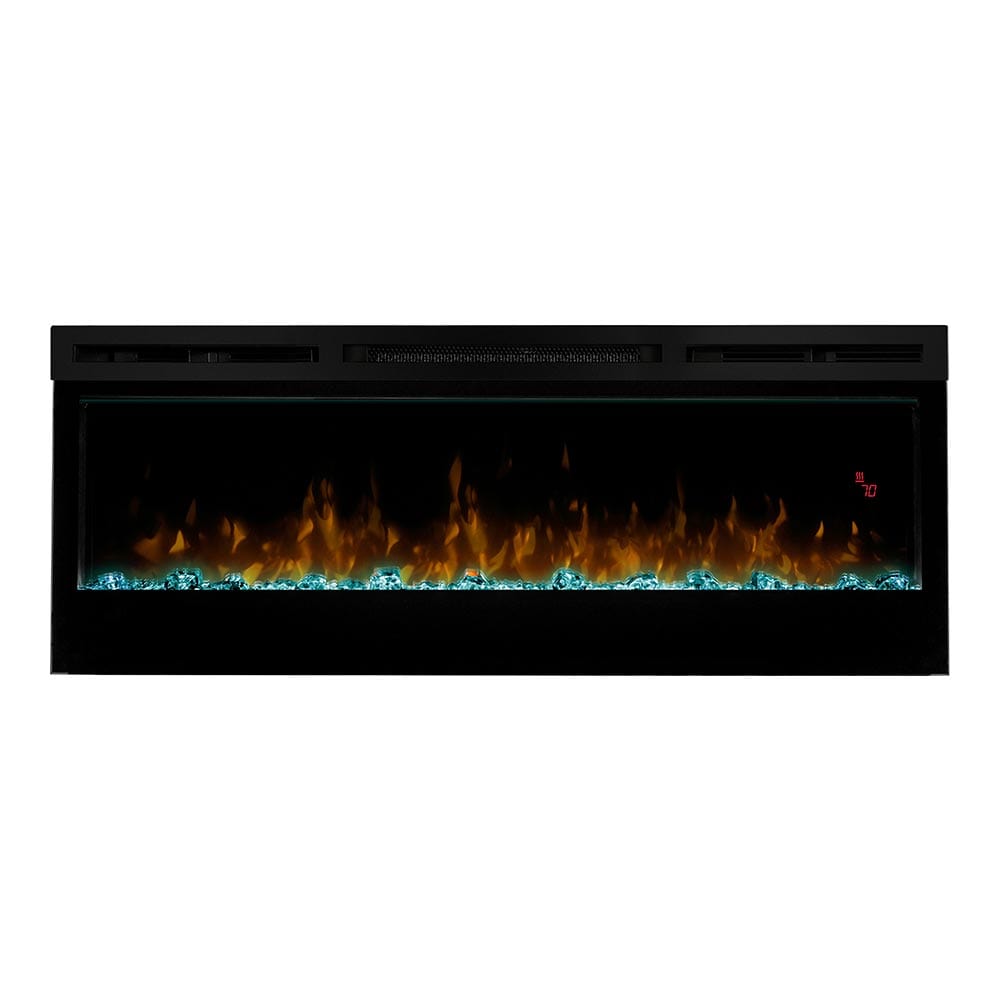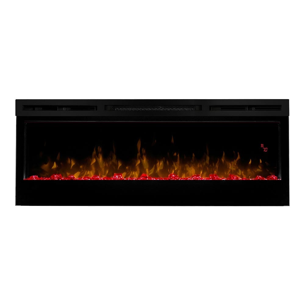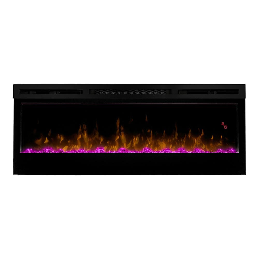 The Dimplex Prism 50" Linear Electric Fireplace - BLF5051 is the latest offering from the best-selling and award-winning BLF50 series. This upgraded electric fireplace has taken something great and turned it into something amazing. The unit's expansive 50-in width makes it a great focal point for your room, as it commands attention with its artistic beauty. The improved flame effect creates an even more realistic flame that perfectly dances from the upgraded, larger, diamond-like acrylic glass ember bed. With the addition of an LED lit ember bed, you can choose from any of the breathtaking choices - Blue, Green, Pink or Red. An integrated LED display easily depicts the temperature setting, sleep timer and color themes as you adjust them from the convenience of anywhere in your room using the included hand-held remote control. Since the flame effect can be run independently from the heater, you can enjoy this stunning fireplace year round. However, when the temperature does drop and your room needs additional warmth, the fan-forced heater easily produces supplemental heat to warm areas up to 400 Sq. Ft. The Prism offers versatility with 3 installation/mounting options. Choose from wall mount, partially recessed or fully recessed depending on your desired look. Additionally, you can select to direct-wire the unit into your electric grid or use the included standard wall outlet plug. The Dimplex Prism 50-Inch Electric Fireplace is truly a sight to see and will undoubtedly become a favorite feature of your home.