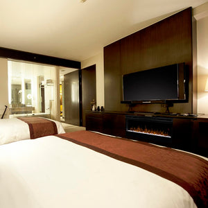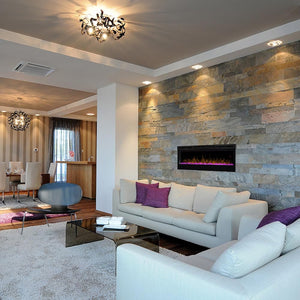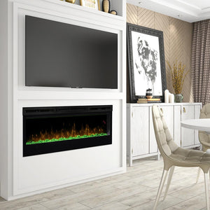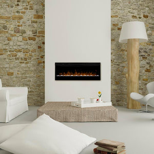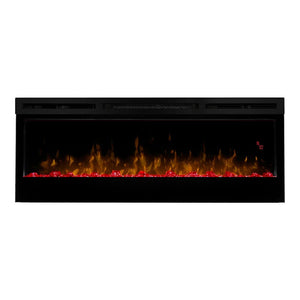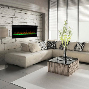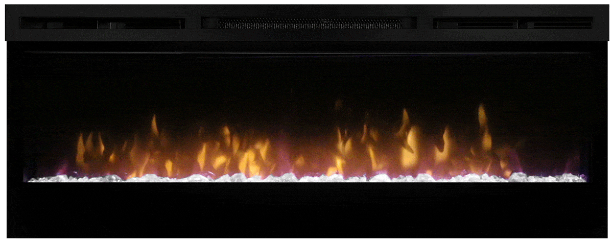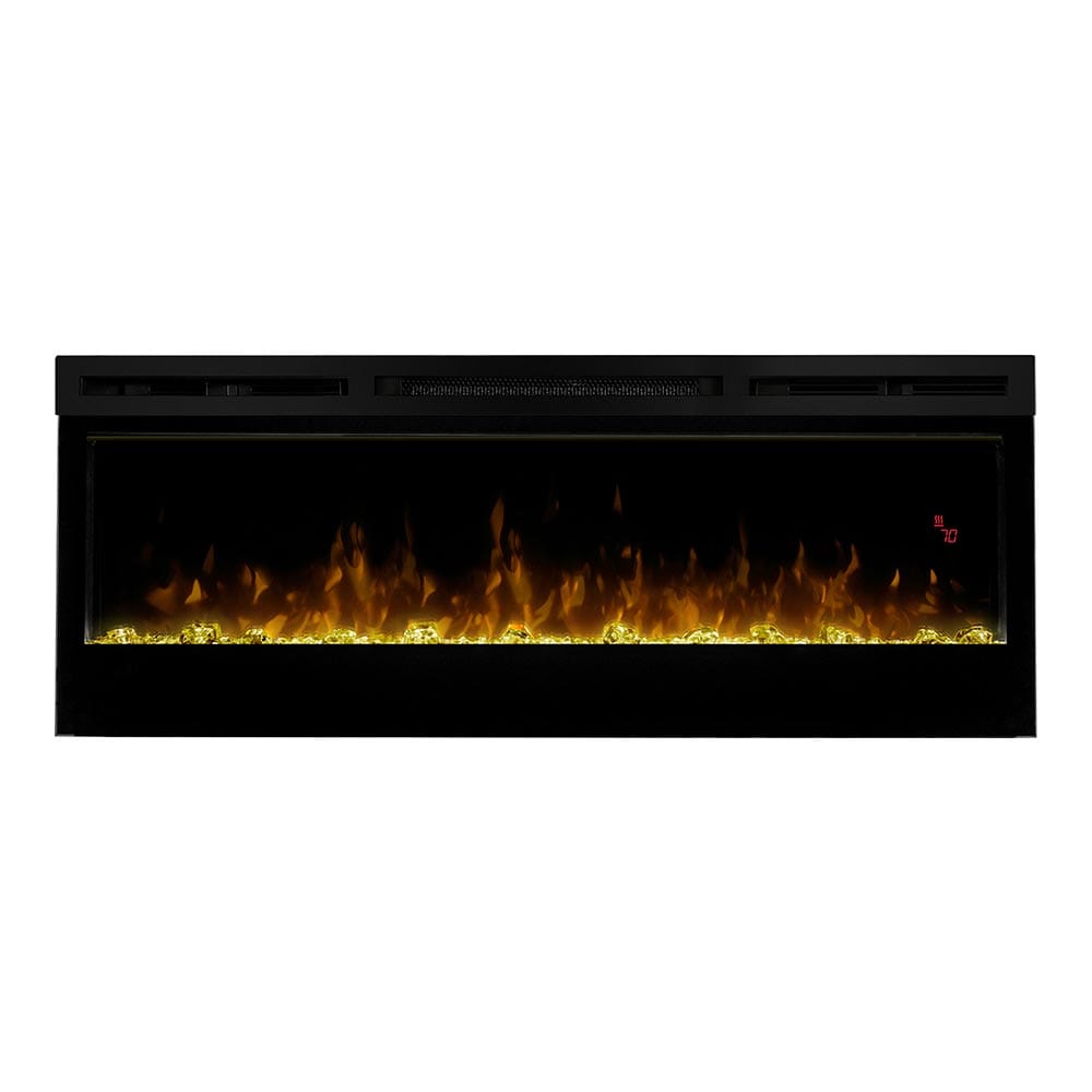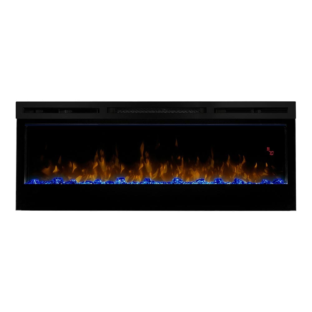 The Dimplex Prism 50" Linear Electric Fireplace - BLF5051 is the latest offering from the best-selling and award-winning BLF50 series. This upgraded electric fireplace has taken something great and turned it into something amazing. The unit's expansive 50-in width makes it a great focal point for your room, as it commands attention with its artistic beauty. The improved flame effect creates an even more realistic flame that perfectly dances from the upgraded, larger, diamond-like acrylic glass ember bed. With the addition of an LED lit ember bed, you can choose from any of the breathtaking choices - Blue, Green, Pink or Red. An integrated LED display easily depicts the temperature setting, sleep timer and color themes as you adjust them from the convenience of anywhere in your room using the included hand-held remote control. Since the flame effect can be run independently from the heater, you can enjoy this stunning fireplace year round. However, when the temperature does drop and your room needs additional warmth, the fan-forced heater easily produces supplemental heat to warm areas up to 400 Sq. Ft. The Prism offers versatility with 3 installation/mounting options. Choose from wall mount, partially recessed or fully recessed depending on your desired look. Additionally, you can select to direct-wire the unit into your electric grid or use the included standard wall outlet plug. The Dimplex Prism 50-Inch Electric Fireplace is truly a sight to see and will undoubtedly become a favorite feature of your home.