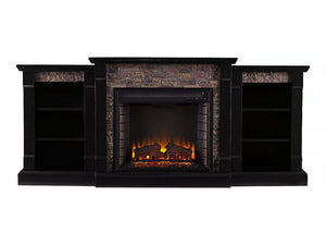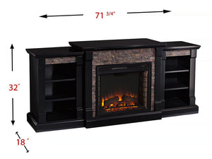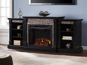 At its center, surrounded by the beautiful faux stacked stone accents, is a nicely appointed 23-In electric firebox. The fireplace features life-like resin cast logs and embers that when paired with the LED flickering flame effects, create a realistic wood burning fire appearance. The integrated fan-forced heater is a handy feature for keeping areas up to 400 Sq. ft toasty and comfortable with supplemental warmth. For your convenience, a multi-function remote control is included and allows you to operate the functions of the fireplace with ease including temperature, flame & ember bed brightness levels as well as on/off timer.