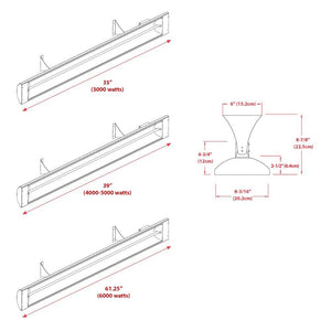 5000W = Heating Area: 9' x 10', Dimensions: 39" W x 8" H x 8" D