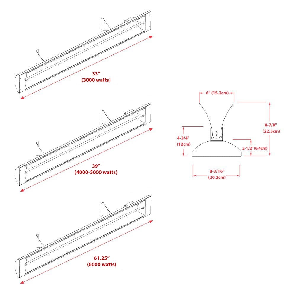 6000W = Heating Area: 11' x 11', Dimensions: 61.25" W x 8" H x 8" D