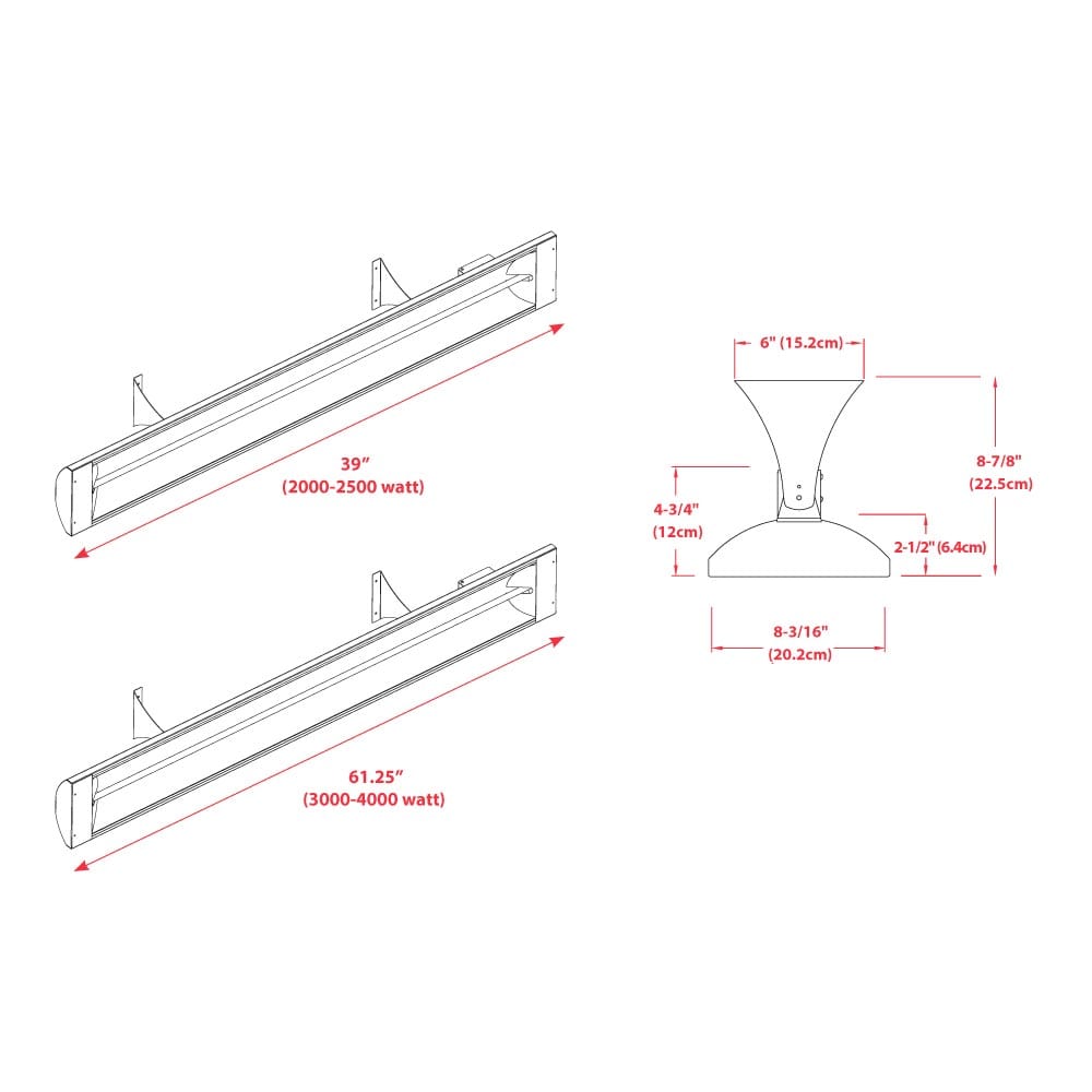 4000W = Heating Area: 10' x 10', Dimensions: 61.25" W x 8" H x 8" D